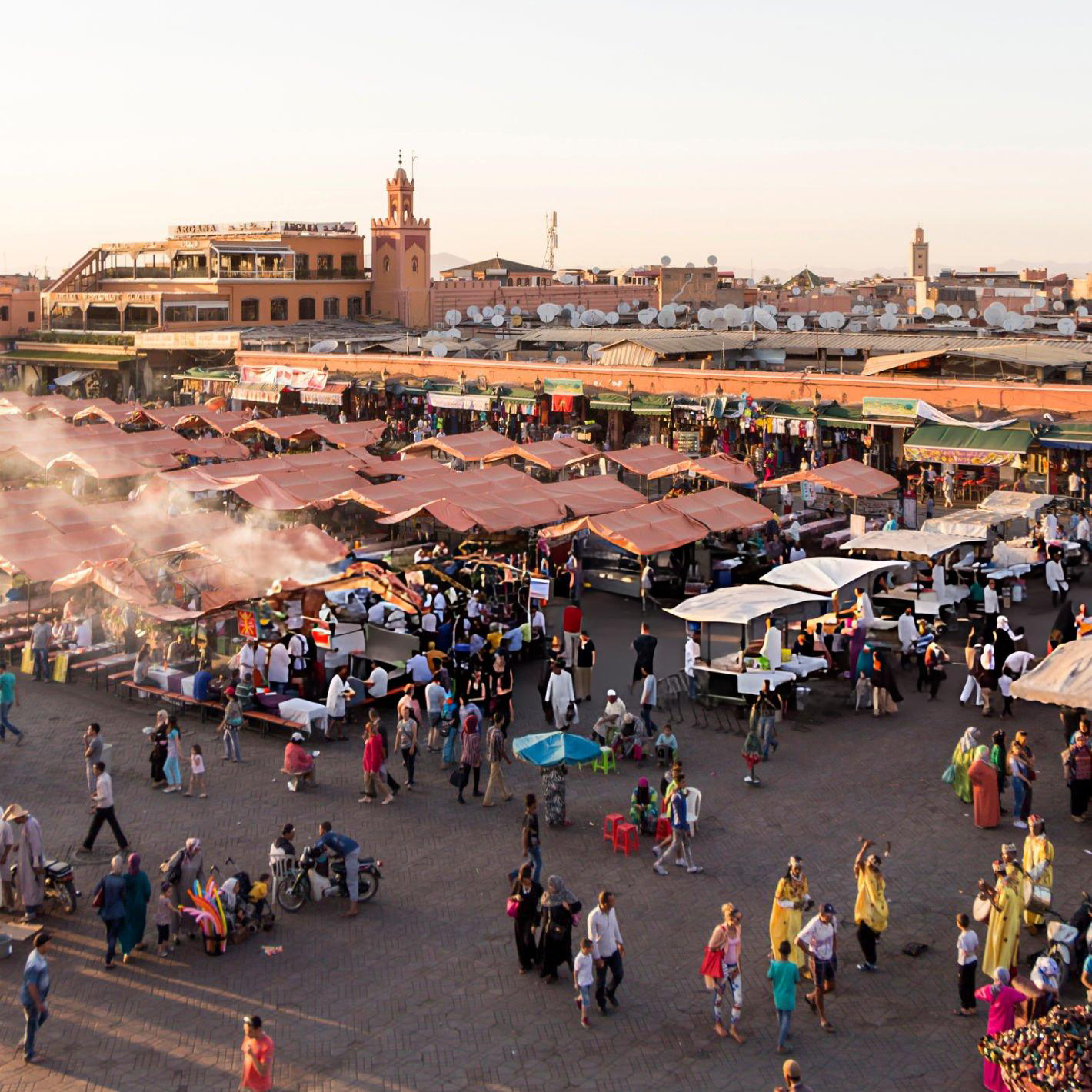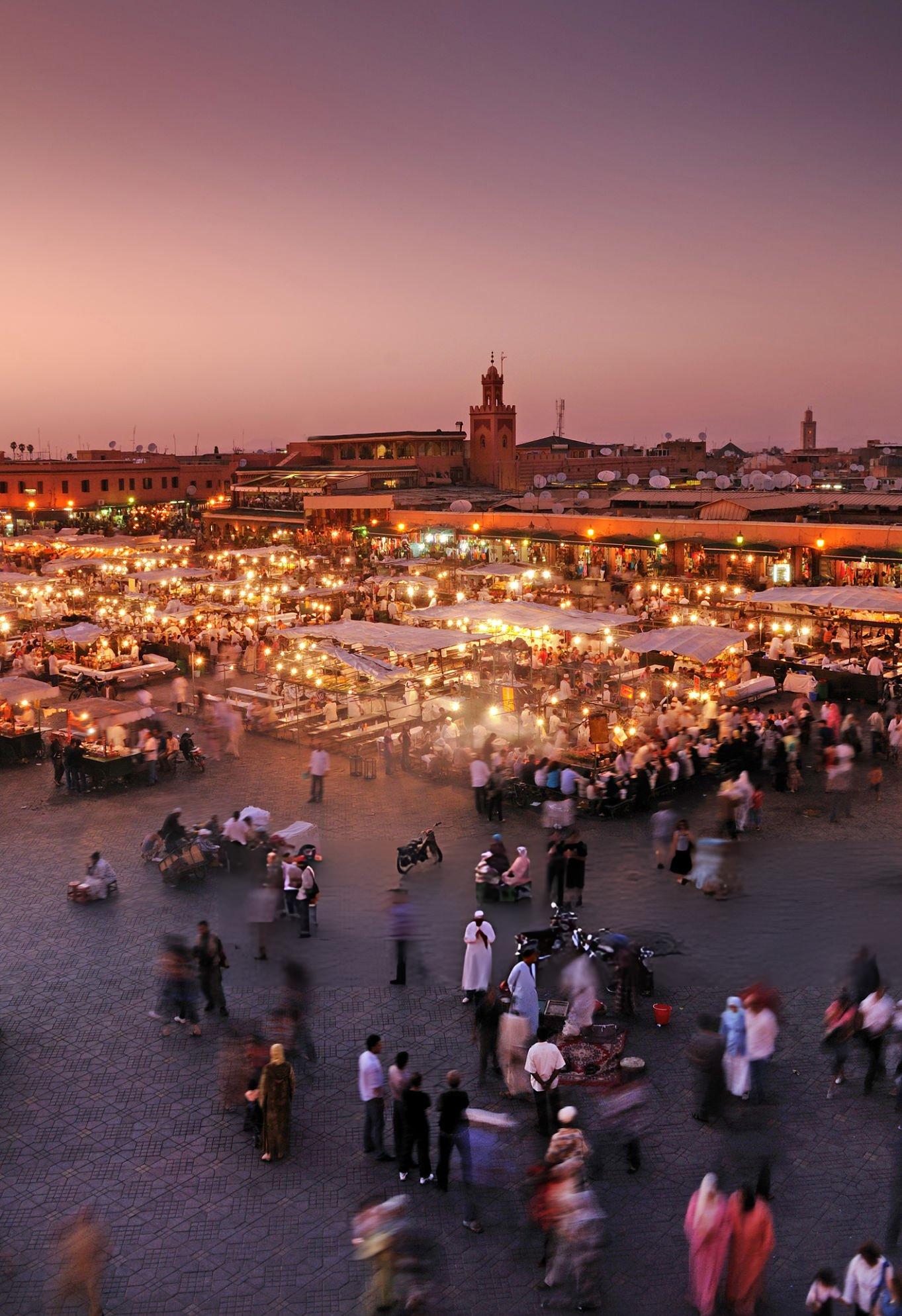 Nearby stands the Kutubiyyah Mosque from the 12th century, featuring a 253-foot (77-meter) minaret built by Spanish captives.